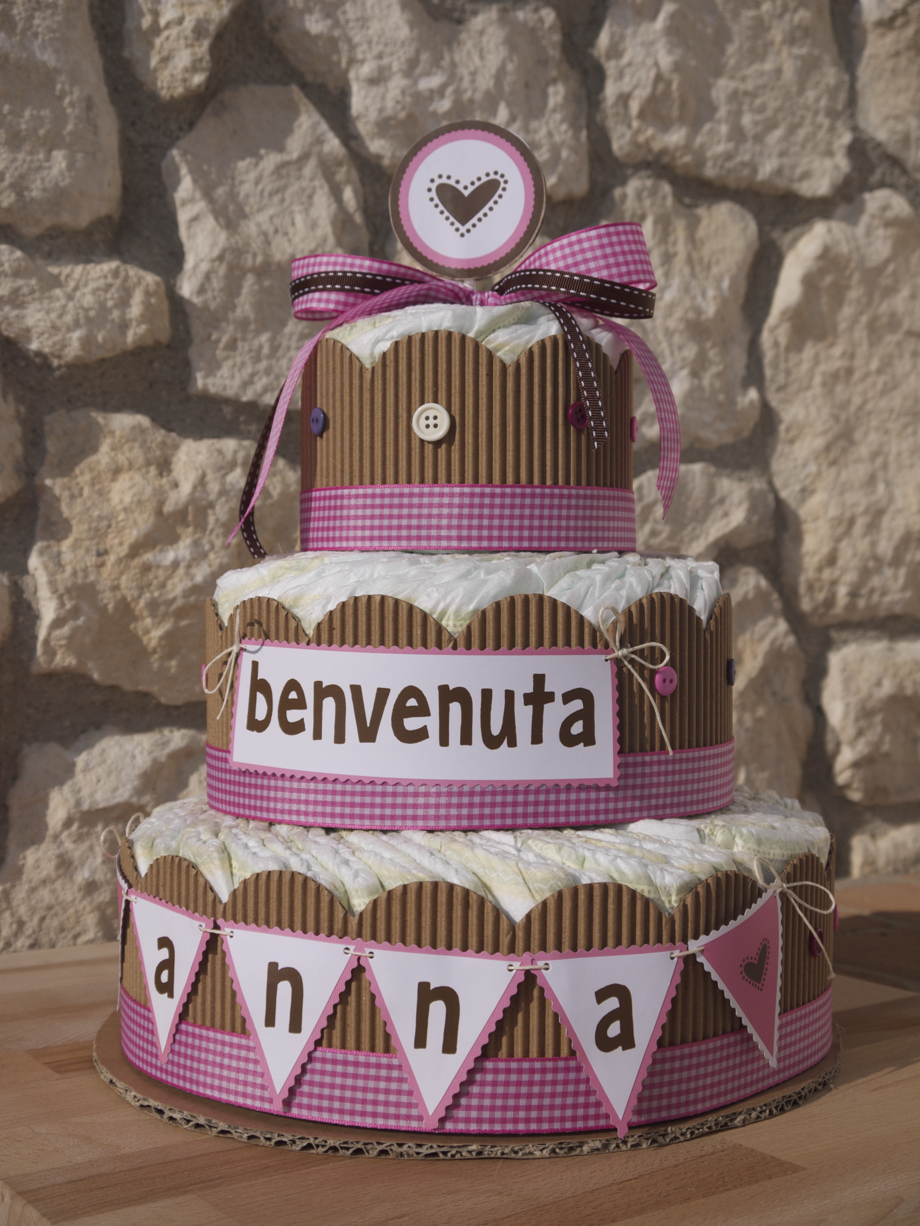 …non si scorda mai! Questo è il mio primo esperimento di torta di pannolini, confezionata per la nascita della bimba di cari amici.